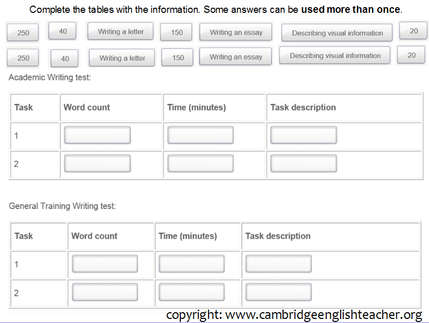 There are plenty of other ideas like this. Here is a screen shot of another review section for the writing module –a gap fill task that can be used to recap the exam structure at the start of class: