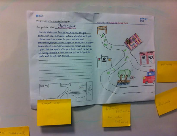 Display posters around the room. In this case, we were designing environmentally friendly parks. Tell students that we will vote for the best ones. Elicit/negotiate different categories to vote for: