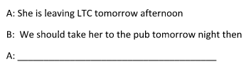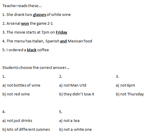 …from which I discuss changes in meaning and lead to a bit of practice. Then I raise awareness of contrastive stress when information is misunderstood. I try to elicit this with tasks like this…