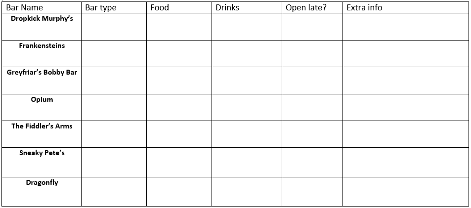 I taught these items in the order above. I covered information related to bars in the penultimate lesson so students were clued up for the final task.