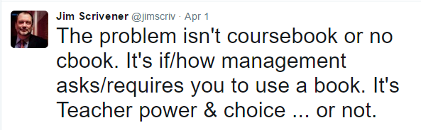 Overall, I quite like coursebooks. That’s because I’ve used them quite sparingly, and I’ve overcome my feelings of ‘deficiency’, as I just mentioned in another post. For me, the key to appreciating a coursebook is not having to use it!  I’ve just seen this tweet from Jim Scrivener, which pretty much sums up my views…