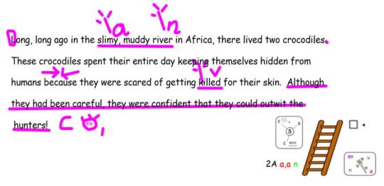 It is important to note here that even though a success ladder is used, we do not use the ingredients with any form of hierarchy. For example, your writing is not better if you include adjectives (bottom of ladder) with no full stops and capital letters (top of ladder). Learners need to be taught this but I haven’t encountered any difficulty with them grasping this idea.