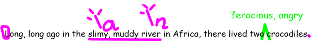 The learner has identified that they have used capital letters and full stops. They have also shown where they have used adjectives to describe the noun. However, they noticed that they haven’t included a 2A sentence and in order to improve their writing, the feel that they need to add some further adjectives, which they do in green highlighter.