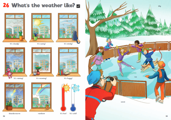 There are usually between 15-20 words introduced per scene (double page). There are a couple of pages where the theme introduces words in a typical grammar structure, like the one for time and for weather, but other than that there are simply word/picture associations on each page. There would be enough space for a phrase bank on most double pages, which could elevate the resource beyond supplementary use. That said, this is a very useful book for supplementary vocabulary input and our YL teachers have already been discussing how they will put it to use in upcoming modules.