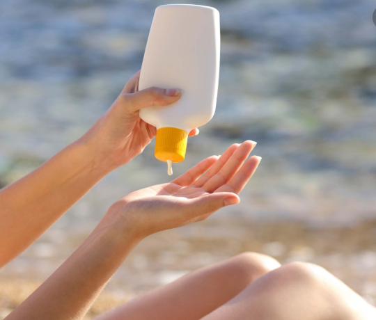 [[Researched photo: an image to match the phrase ‘I enjoy sunbathing’. Someone rubbing sun cream onto their arm, or squeezing it onto their hand, or something]