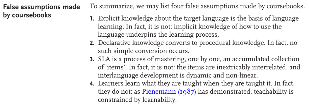 I may be off the mark here, After all, I’m a teacher who values research, I am not a scholar. I welcome corrections, refutations, and any other comments that will help myself and others explore this topic. As a writer, I will only benefit from a deeper insight into SLA theory and how this is applied in coursebooks. I’ll hopefully get around to musing over those other assumptions in more detail too.
