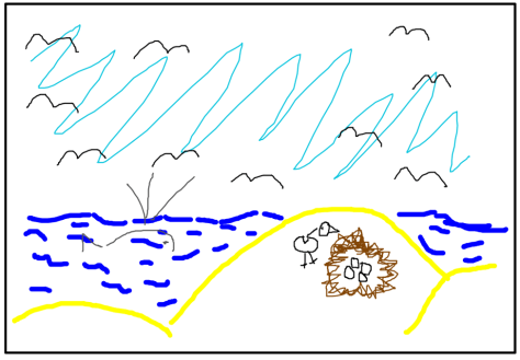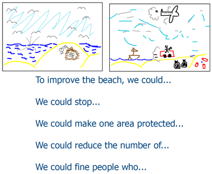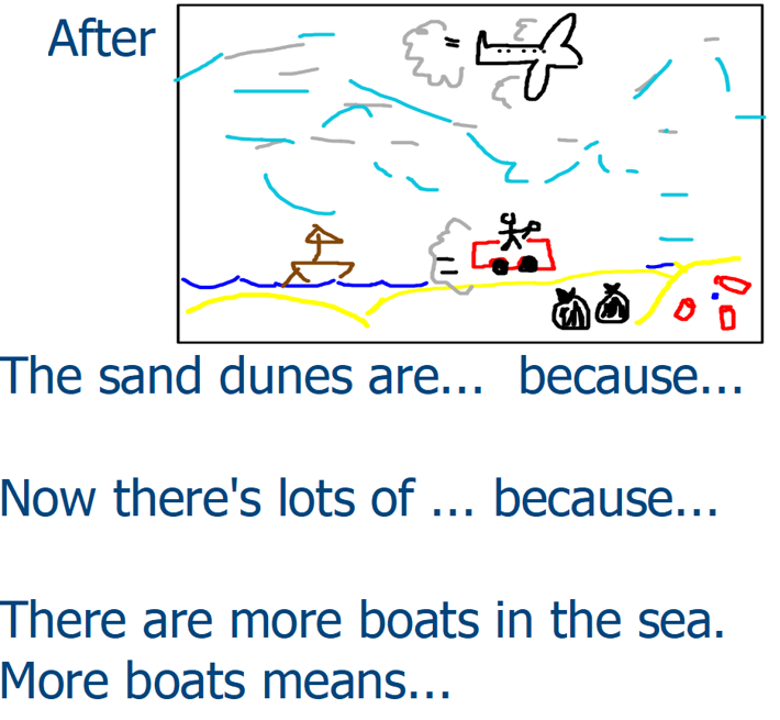 Step 4: In the top right-hand box, learners draw their beach again. This time, they imagine the beach after humans have been allowed to go there. Some of them see where this is going…! I demoed one thing that might change to my first image.