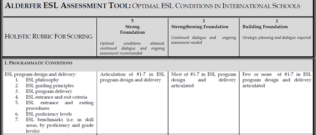 Alderfer and Alderfer (2011) state that there is no unifying set of criteria to assess ESL programs in international school contexts. Their research sets out to provide one.