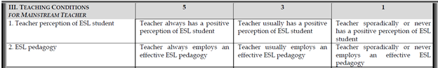 The home culture conditions are slightly more measurable, things like students being able to read to an age-appropriate level in their L1. Still, it’s not the most comprehensive rubric upon which to assess an ESL program.
