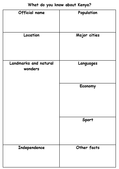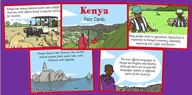 - Download Twinkl’s Kenya Fact Cards. Fairly simple language, concise facts, not daunting for the learners, and visual supports. Print them out – waste the schools budget with full colour.