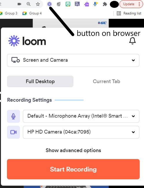 Basically, Google ‘Loom for Chrome’, add the extension, then pin it to your browser. Whenever you want to record a vid of you/your screen/you and your screen you just click the Loom button and you get a drop down recorder appear: