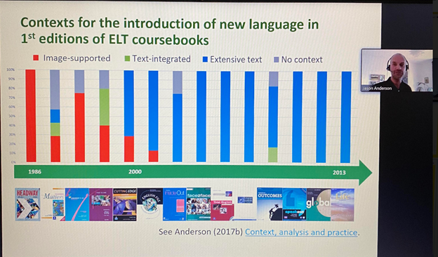 A very interesting webinar last week from Jason Anderson on lesson frameworks. I’ve summarised it here. He mentioned some of his previous research into ELT coursebooks with some interesting findings. Snapshots…