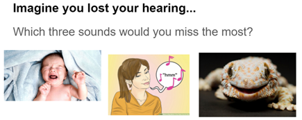 My examples were my kid crying, my mum humming, and a gecko’s ‘TUUUKKKAY’. I definitely wouldn’t miss the sound of my kid crying, I was just out of ideas.