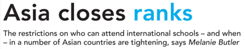 The examples of restrictions in Japan and China in the second article really don’t tell the full story. The relaxed approach to caps on host-national enrolment in countries such as Malaysia was mentioned, but could have been explored in more detail as a counterargument, especially given rapid expansion of the international schools market in that country. The article suggests that the number of host-national students enrolling in international schools in countries across Asia is increasing. Is the situation in China simply an exception, and is it likely to be much of a problem?
