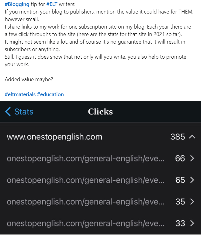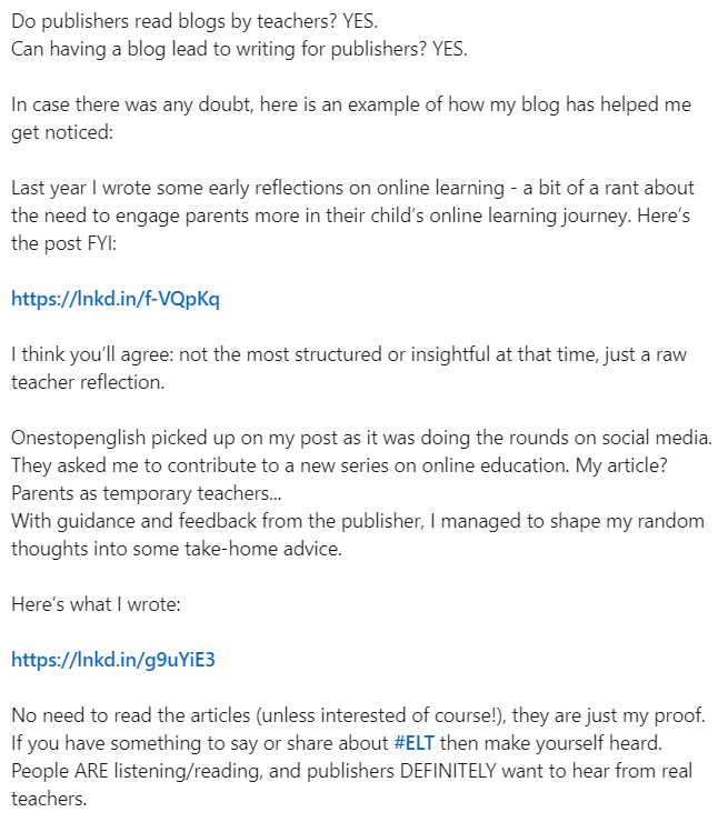 This doesn’t require a big change or lack of integrity on your part as a blogger. Keep doing what you’re doing with the useful resources for your blog audience. But if you think ‘Hmmm, this would be good for XYZ publisher’, then get on LinkedIn, add some of their commissioning editors, send them your work. Also, send it to Onestopenglish lesson share, and forward it to English Teaching Professional or MET asking if they’d like you to build an article around it.