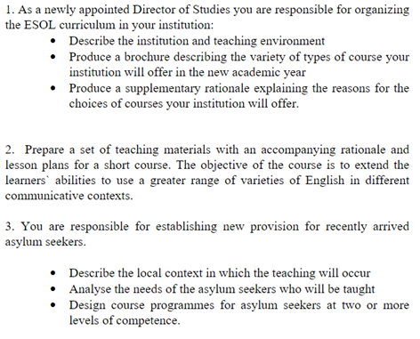 - Don’t give yourself too much work. If you need to evaluate materials, ask if there’s an in-house checklist you can adapt. If you’re writing a syllabus, ask which docs are already available to help. Etc. Ask in school, maybe ask for general guidance on social media (places like the DipTESOL survivors group).