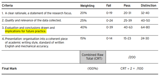 - DON’T FORGET to mention implications for future practice. Think of these as implications not just for you but for learners, teachers, processes at your school, whatever. Mention (if relevant) adaptations you might make to resources in the future based on your findings.