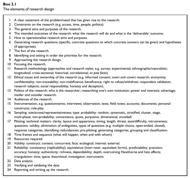 I know that the IRP is kinda small-scale so I don’t wanna get all intense-MA-style on you here. However, one resource I’ve referenced a lot from my MA research is the ‘planning matrix for research’ that’s in Cohen et al (2007). There’s a good summary of the key elements of research: