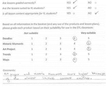 As I said, my product was a teacher guidebook including practical lessons. I’ll be honest, they look atrocious now so I’m not sharing them, haha! I asked teachers to evaluate the resource as a whole, and to reflect on the individual lessons they used in the resource.