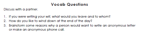 • There’s a vocabulary pre-teach task (just as with Sapp’s SWE resource) which is useful and of course the teacher can adapt if needed. I like that there a few follow up questions related the vocab once introduced, but not overkill.