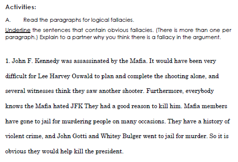 My favourite activity in the supps was one on logical fallacies. It explains eight common fallacies (cherry picking, ad hominem, strawman, whataboutism, etc) and guides the learner towards identifying these in a text: