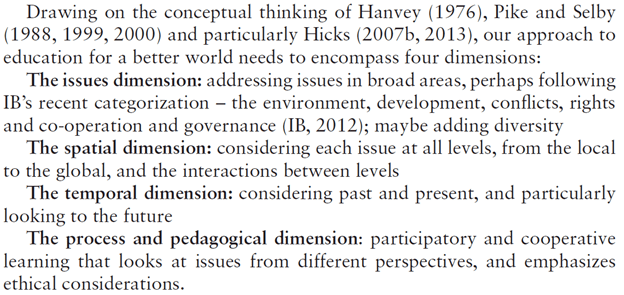 I can see this hook working as the IB is (or as a brand is marketed as) a product which seems to merge transformative, ecological and economic codes of education. The trouble, as always, is going from principles to practice. As Boyd Roberts (in Pearce, 2013) points out, the IB product sounds favourable yet it lacks clear guidance on practical application. Roberts himself has made attempts to solve this problem.His brief ‘guiding framework’ is a useful starting point in addressing the need to relate the IB principles to classroom practice: