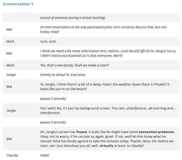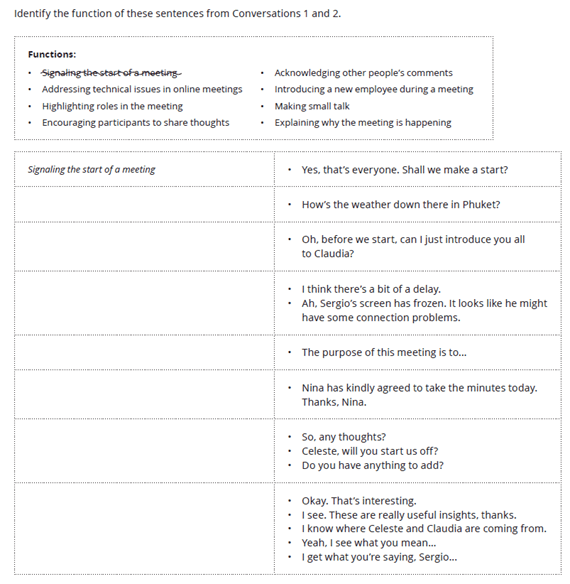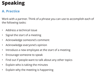 As the name suggests, we went down a functional language route with this one. We wanted practical phrases for both transaction and interaction in everyday business contexts. We were also keen to demonstrate the range of phrases learners might encounter or use that serve a similar purpose. That meant some of our listening texts were quite long, or multiple texts were used within a lesson. We didn’t want a rigid kind of ‘here are the target structures’. Instead, we went for target language but alongside natural features like phatic conversation, non-fluency features, vague language, that sort of thing (lol).