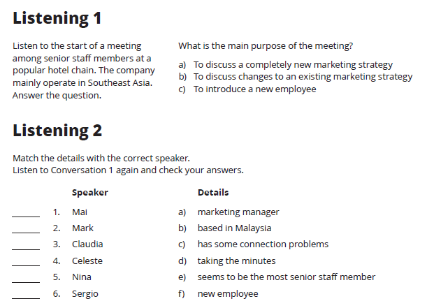 My main focus as a writer was on developing listening skills, with a focus on ‘meaning-building’ tasks. In my experience as a business English teacher, my learners often struggle to stay focused in meetings, presentations and so on, so I aimed to provide plenty of opportunity to focus on grasping the overall meaning and not getting bogged down or dwelling on details.