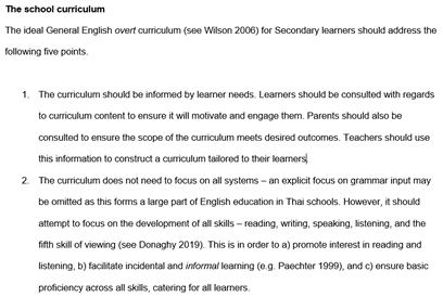 - Note, try to be as objective as possible here. For example, if you are looking at the curriculum of the school, look more at the content as it is intended to be delivered according to syllabus documents. Don’t fall into the trap of critiquing everything straight away at it will seem biased. Facts first if possible.