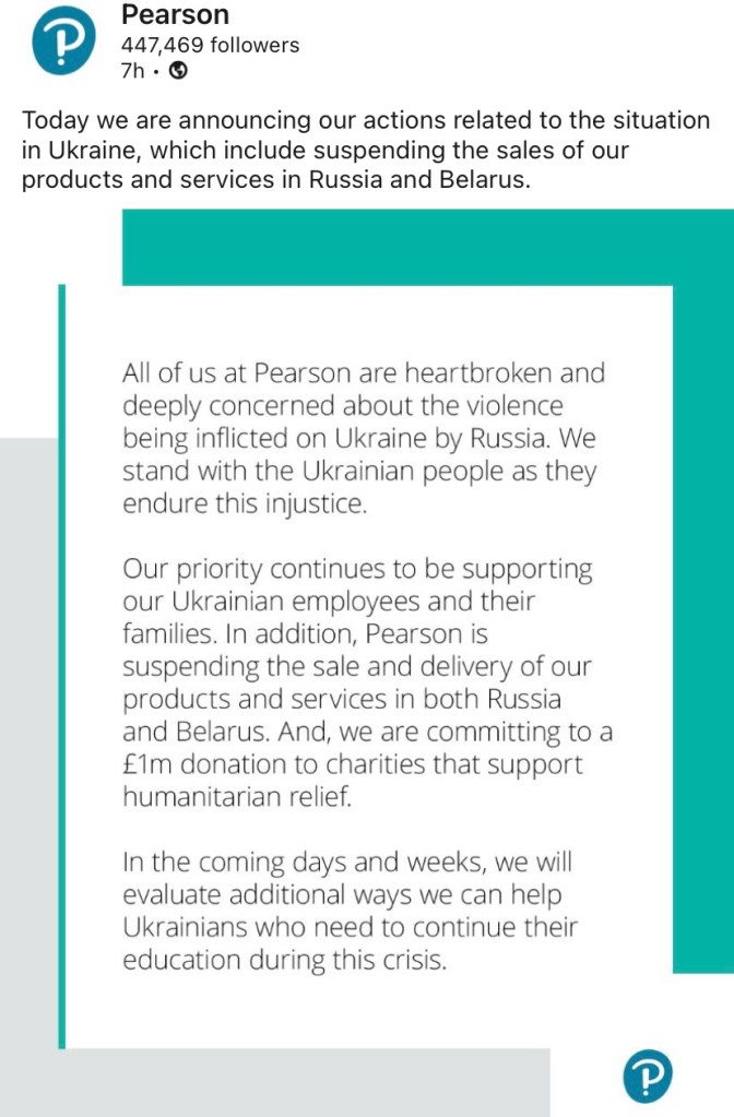 Various publishers pledged support for Ukraine when the conflict began to unfold. Example from Pearson.