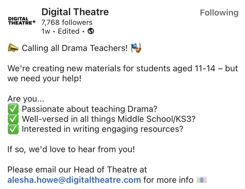 Shared this last month with our drama teacher. Sounds like a cool opportunity for any Ken Wilsony type people.