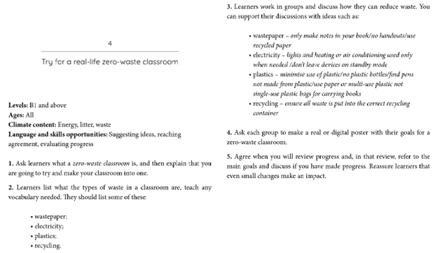 This resource is an ideas bank for ‘greening your teaching’. It includes ideas to help you bring the topic of climate change and sustainability into ELT classes, and for localizing such issues. It also includes activities for greening institutions, not just classrooms – embedding a green culture in schools.