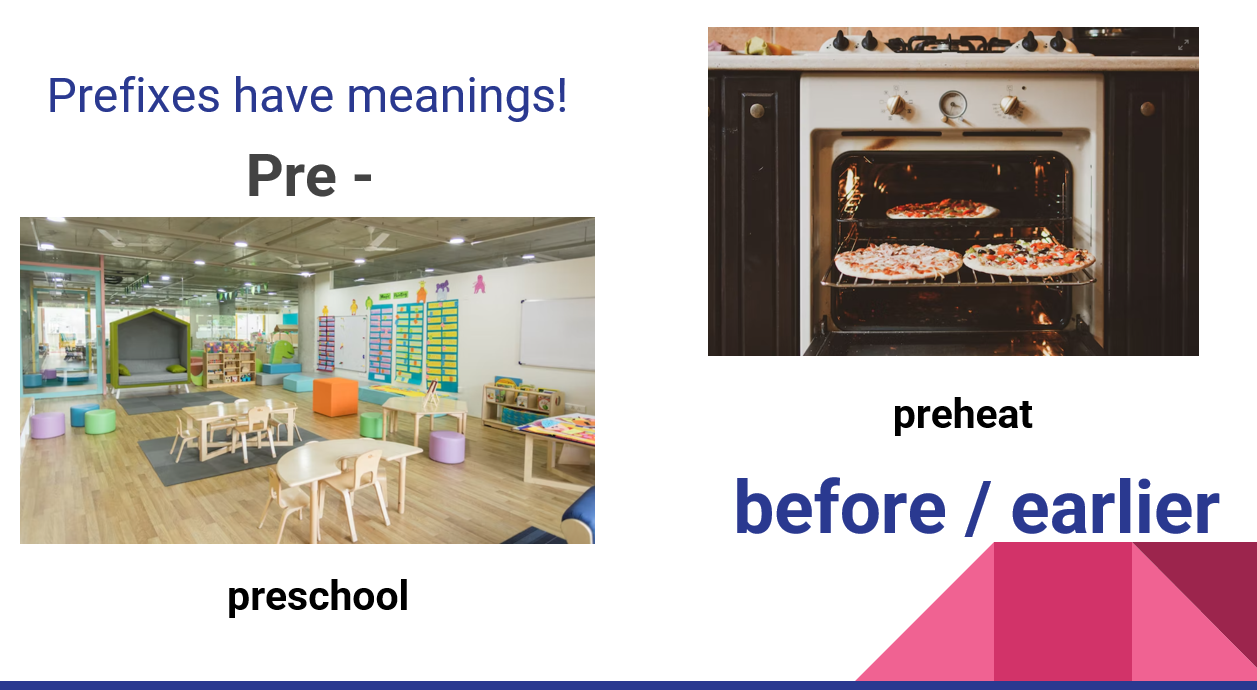 Briefly explaining prefixes, then giving examples and meanings, for prefixes like pre-, un-, dis-, re-…