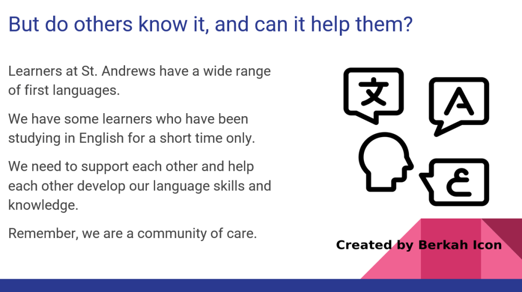 Last term, I was asked to do a quick EAL ‘assembly’ during tutor time (15 mins max). The aims were up to me. I just went for something simple: point out patterns in language, remind learners to help each other to build word knowledge.