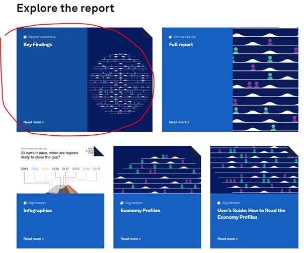The intro to the Key Findings, and the ‘Global results and time to parity’ sections make for a useful text. They are full of useful language for analysing data, which can be drawn out. Certain paragraphs could also be used as a model, which learners could compare their own attempted summaries against – there’s an instant WAGOLL there!