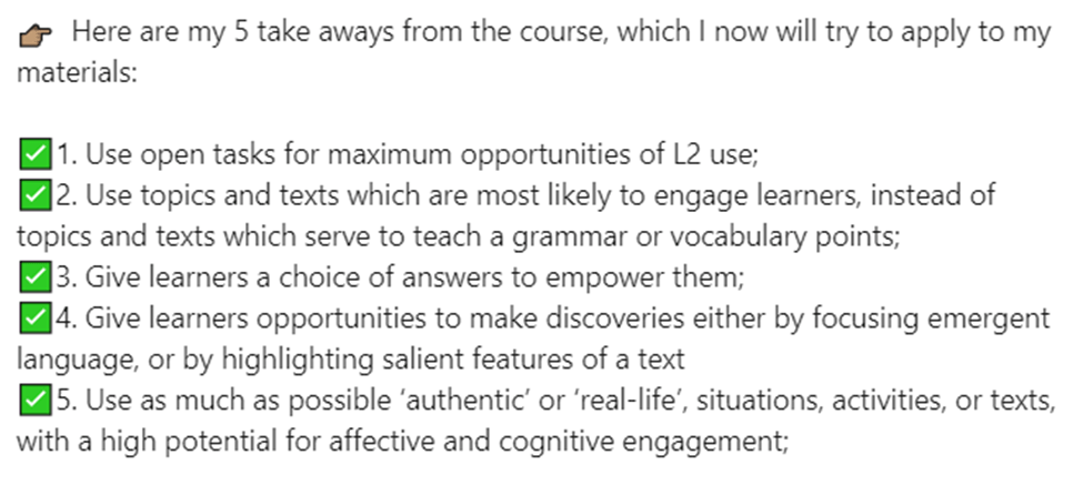 Huge congrats to Anthony Schoch for getting a Distinction on the Materials Development for Language Education module through NILE. Anthony summarized his take-home points on materials development from the course, useful thoughts: