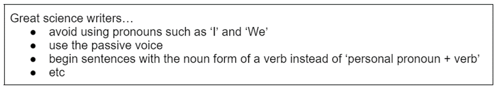 Some lists are better than others, like ones that include clear examples in context. Some tend to offer tips that are mixed between form-related tips and functions, although the latter sometimes lack examples which isn’t that helpful: ‘Great science writers make their language sound objective’.