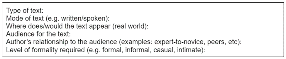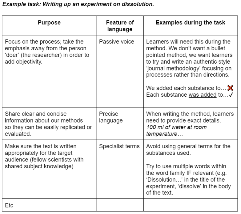Science teachers – lead with the ‘functions’. Review the target text you’d like the learners to replicate. Notice salient features of language, but think about the function they perform. Note down the function or purpose, then the language choices that help to achieve that function/purpose: