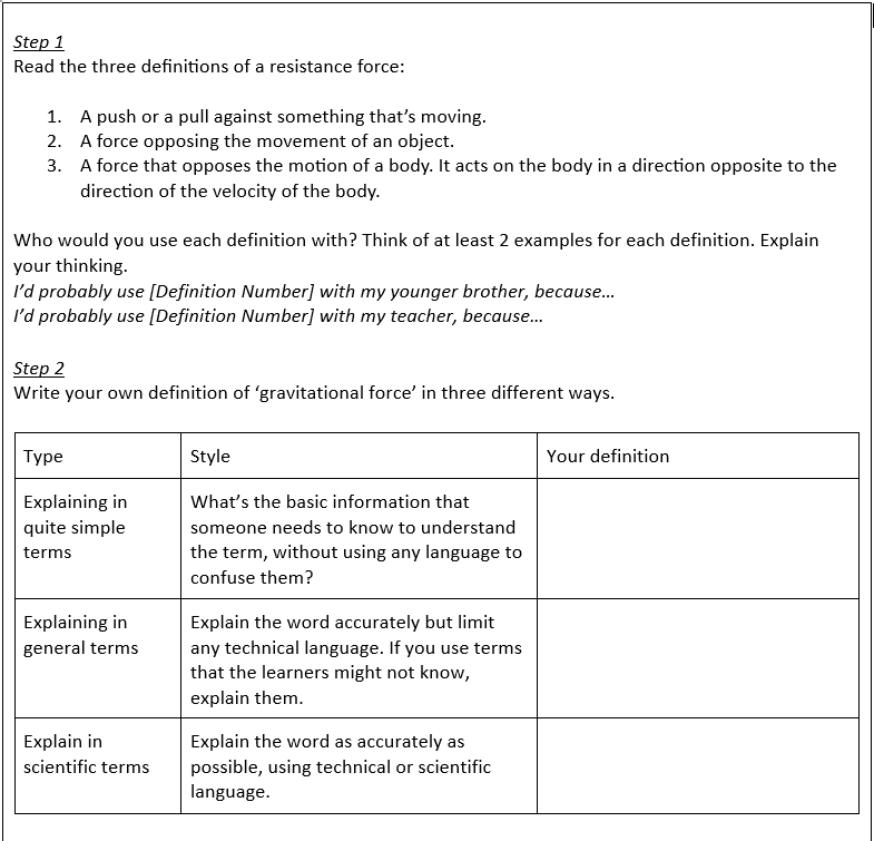 This is just one example, but it’s the type of activity that subject teachers could use as a DO NOW, Starter, ‘literacy focus’, etc, that supports learners to review some foundational concepts needed in disciplinary writing.