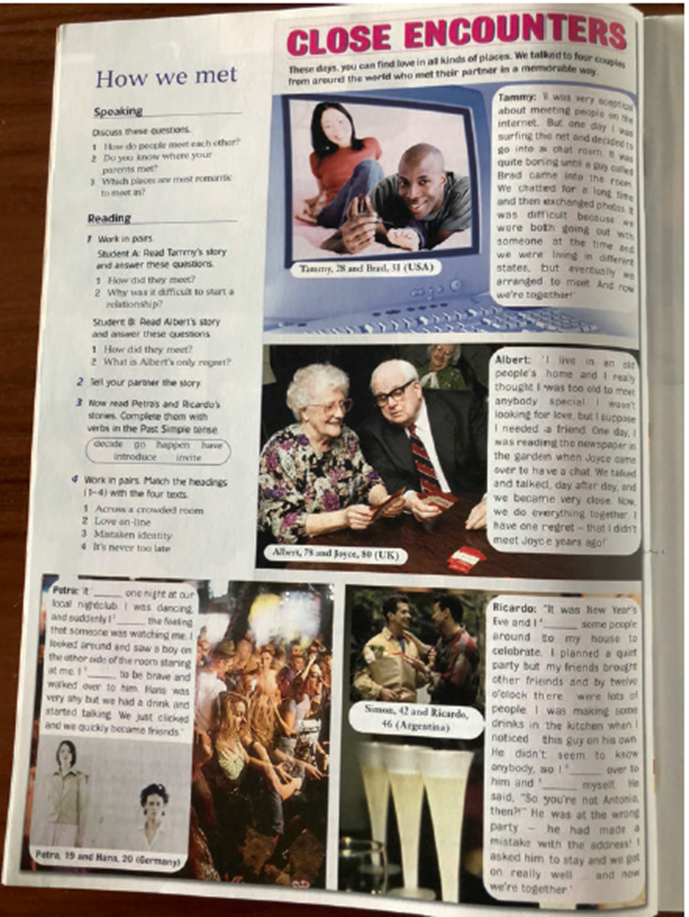 The approach was to embed and normalize gay content within typical General English coursebook themes (‘sport’, ‘relationships’, etc). Same-sex couples featured in texts and images but there was no overt mention of their sexuality. Here is a screenshot from the book ‘Framework’ provided by Goldstein (2021:353):