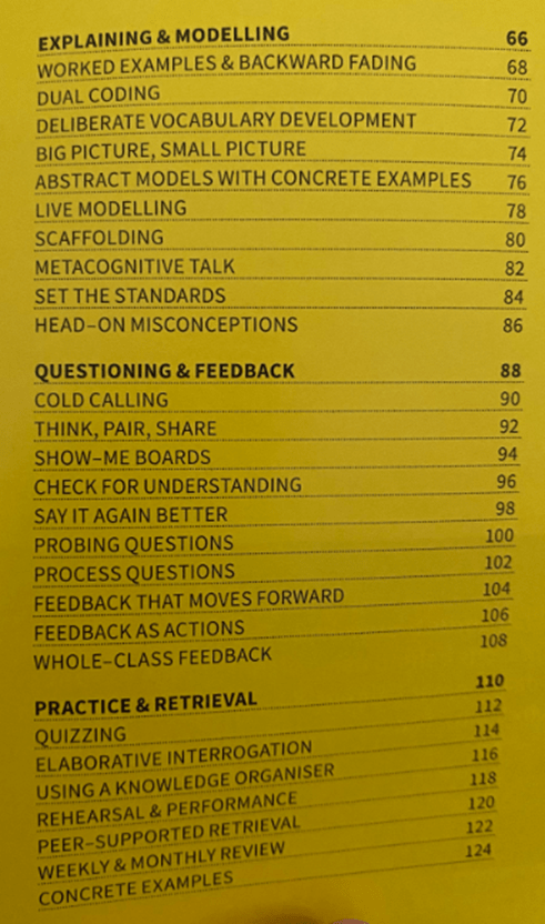 This is a super resource that serves many purposes. It’s a great bank of strategies for developing core teaching skills. It’s a useful grounding in (some of) what’s currently considered ‘good practice’. It’s a springboard for further research, a handbook full of things to ponder in your down time, a guide-on-the-side (as there’s a clear practitioner’s voice throughout the resource), and would be a great reference tool for CPD programmes – especially higher up the school. The strategies are wide-ranging, and yes, the authors *perhaps* cherry pick ‘evidence’ at times for what is considered effective practice. Don’t we all…
