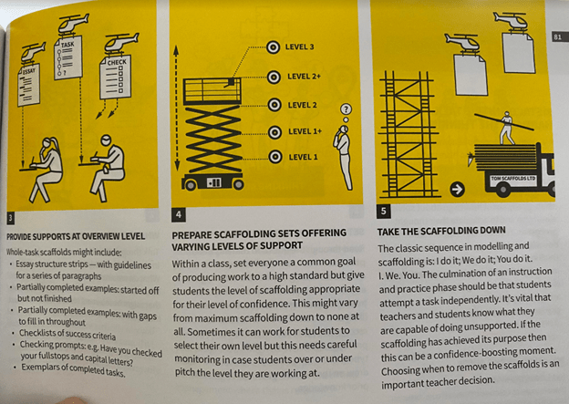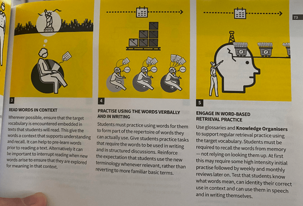 I found that every subsection of strategies had plenty of useful content for me. The questioning and feedback section was particularly useful for two reasons. One, I thought the sequences for ‘probing questions’ and ‘process questions’ were really good and are strategies I can instantly apply in my practice. Two, because the five-step sequences for certain strategies such as ‘cold calling’ and ‘checking for understanding’ were somewhat problematic from an EAL perspective. This is not a criticism – it highlights the value in this ‘hub model’. We can all recognize areas in which sharing our understanding can help adapt these strategies to better suit our context. It’s quite empowering to feel that. Equally, there are strategies I read (a lot of those in the Behaviour and Relationships section, eeek) where I felt much more of a novice. I’d imagine being more of the ‘stick to the central model!’ type teacher here, and would benefit from dialogue with colleagues to help improve my practice.