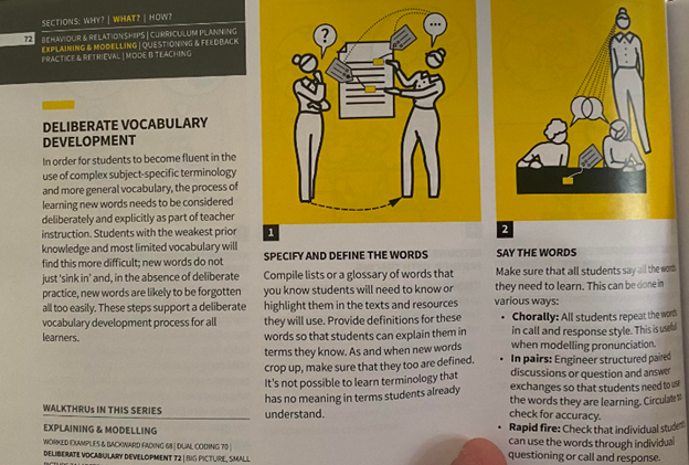 I found that every subsection of strategies had plenty of useful content for me. The questioning and feedback section was particularly useful for two reasons. One, I thought the sequences for ‘probing questions’ and ‘process questions’ were really good and are strategies I can instantly apply in my practice. Two, because the five-step sequences for certain strategies such as ‘cold calling’ and ‘checking for understanding’ were somewhat problematic from an EAL perspective. This is not a criticism – it highlights the value in this ‘hub model’. We can all recognize areas in which sharing our understanding can help adapt these strategies to better suit our context. It’s quite empowering to feel that. Equally, there are strategies I read (a lot of those in the Behaviour and Relationships section, eeek) where I felt much more of a novice. I’d imagine being more of the ‘stick to the central model!’ type teacher here, and would benefit from dialogue with colleagues to help improve my practice.