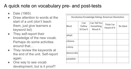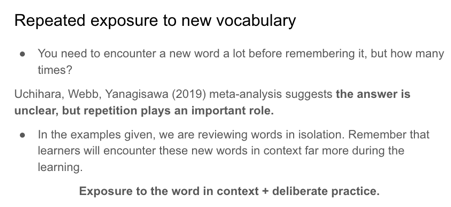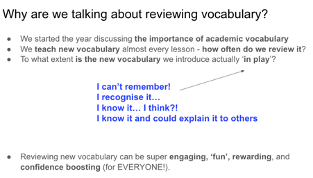 Our teachers are a hugely receptive audience. I received a fair few follow-up emails on this one, and some quite rewarding chats. Some staff approached me soon after to say they’d applied some of the techniques in their own classes. While I can’t say that this was a consistent thing, I love the fact that the session at least raised awareness of the need to review vocab, and got teachers experimenting and taking the leap! So, great. Long term? Not sure.