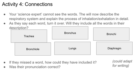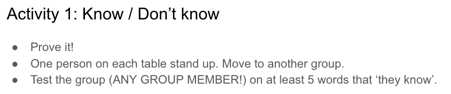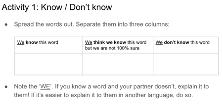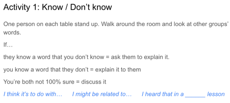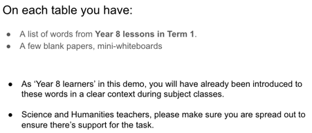 I usually base EAL CPD around specific areas for teacher development which arise from working in-class with subject teachers. In this instance, I couldn’t do that, as my timetable made it tough to get into class. I relied on feedback from my team of EAL support staff, who regularly supported in-class. They suggested that reviewing recently taught vocab was an area that some teachers could address, so we ran with it.