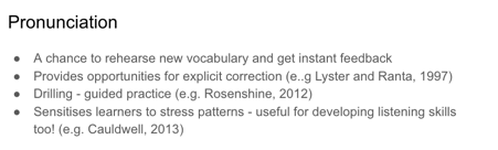 After the 45-or-so fun minutes (I front-loaded the fun…), I went on a 10 minute ramble about why/how these activities would/might be beneficial for learners. Example slides for the boring bit: