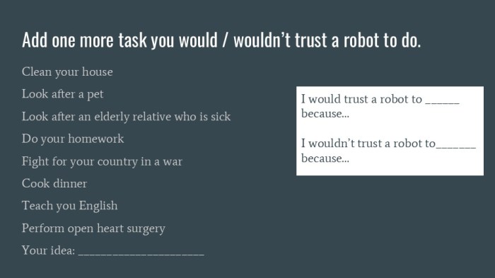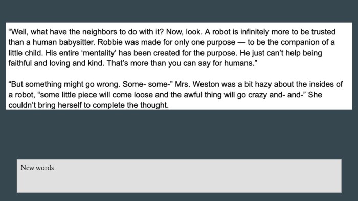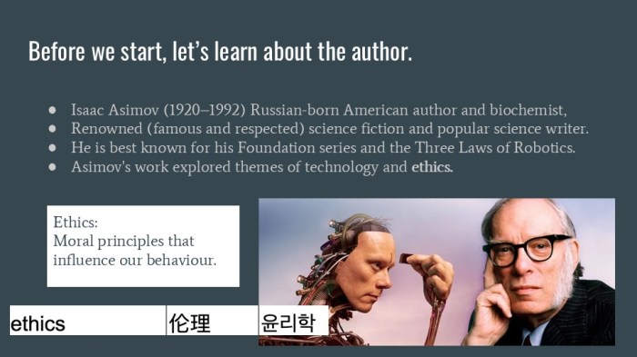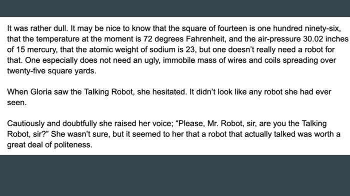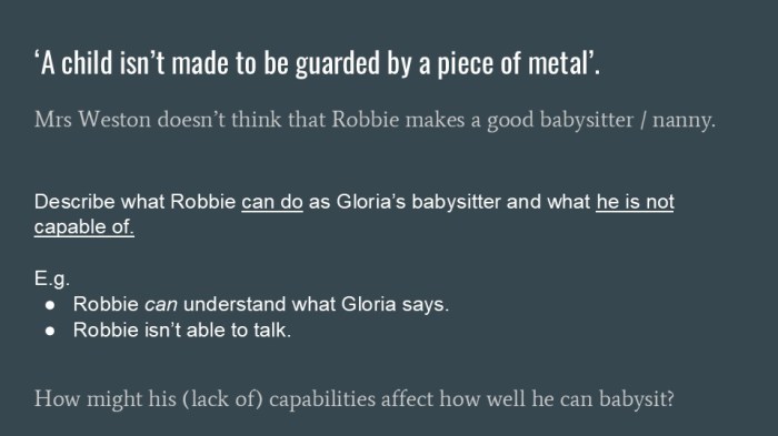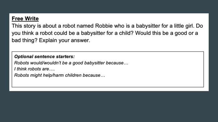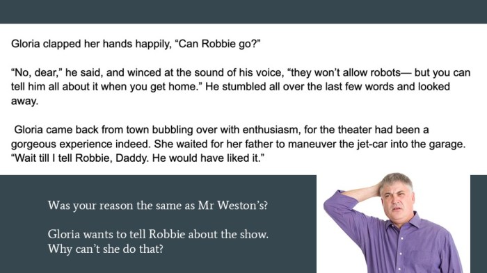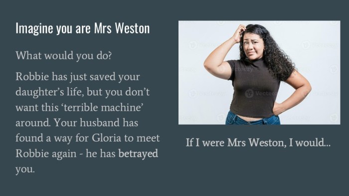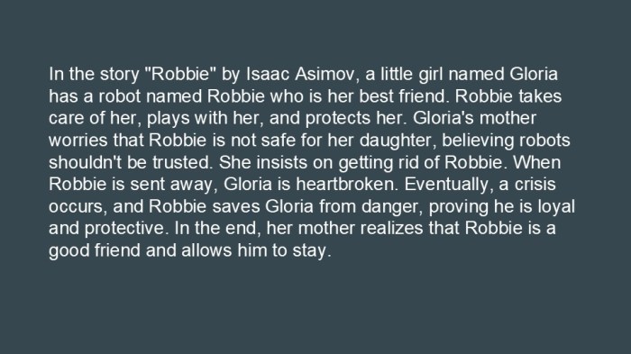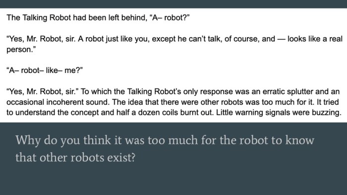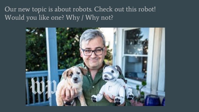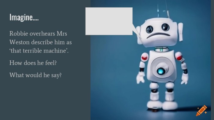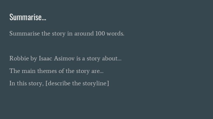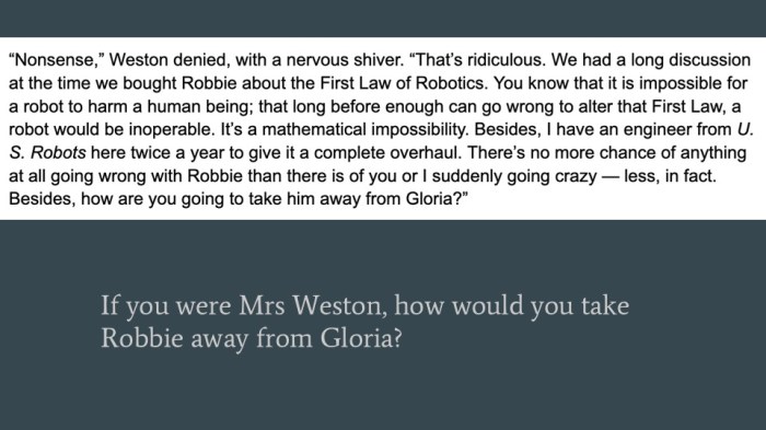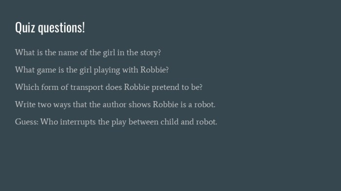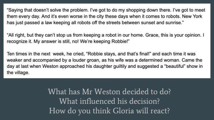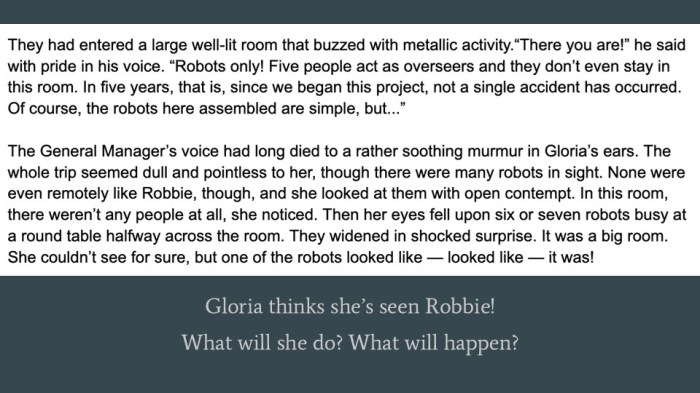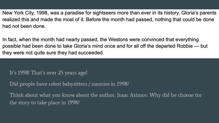 Last year, I was teaching a group of A1-A2 level multilinguals (Year 8, aged 13) in a support group. We were looking to introduce them to authentic literature. I had a flick around on Teachers Pay Teachers and found that someone had adapted Robbie (Asimov) into an even shorter version. I downloaded it and built our content around it. Here were the slides – the videos are embedded if you download it: