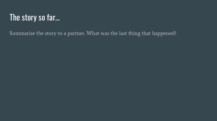 There’s not much explicit teaching of grammar/vocab in the slides as you never really know what’s needed. Sure, I can predict a few things, but I’d rather draw out others as they arise. Plus, I prefer to get learners invested in stories and lit first rather than kill with language nuggets and that.