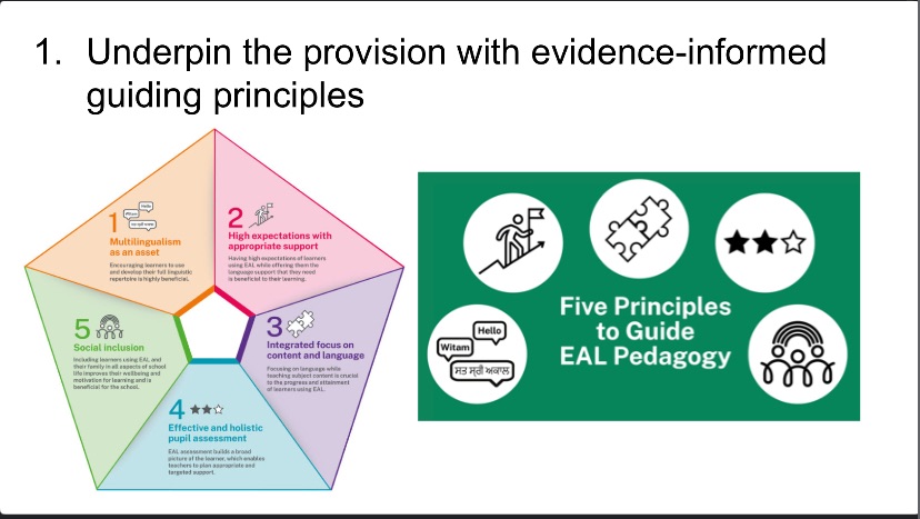 First and foremost, a school needs a set of guiding principles. A good place to start is by looking for established guidance from experienced EAL providers. The Five Principles to Guide EAL Pedagogy from the Bell Foundation, are a good starting point.