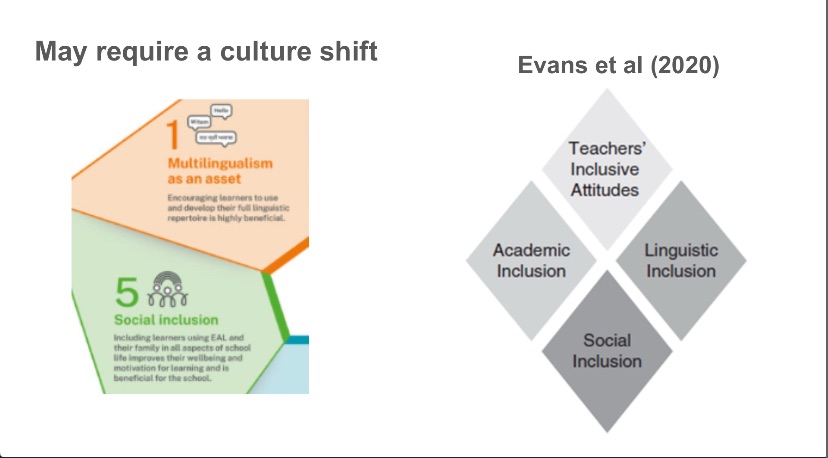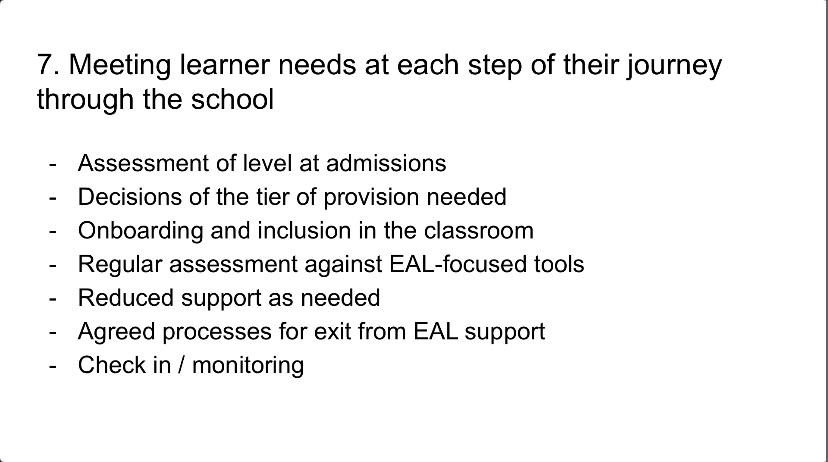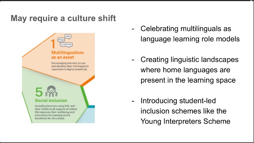 Ensuring that these guiding principles are for all staff, not just an EAL team, is important. We want staff to buy into a culture of inclusion and a shared responsibility for the development and well-being of our multilingual learners. It is important to share practical examples of how these principles can be enacted. Many teachers may feel that Principles 2, 3, and 4 are more intuitive or applicable for classroom practitioners, but Principle 1 and 5, in my experience, may require a culture shift in some schools.